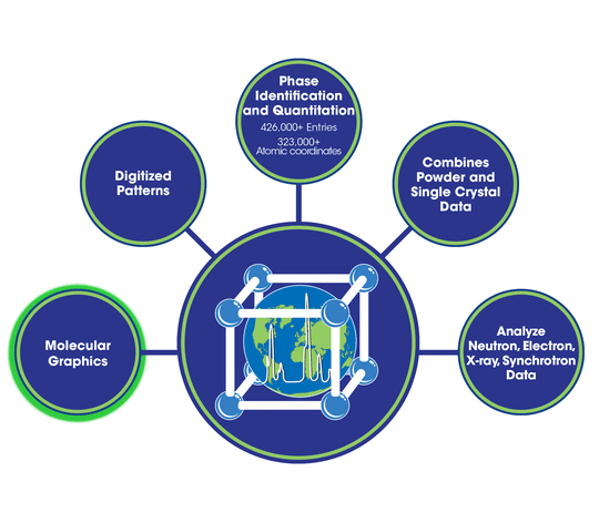PDF-5+数据库涵盖之前PDF-4+和PDF-4/Origanic的所有数据,为无机物和有机物综合性数据库,用于XRD数据的定性和定量分析,是一个综合性数据库!PDF-5+中所有数据条目含有粉末衍射数据、单晶结构、二维德拜环、选区电子衍射(SAED)、电子背散射(EBSD) 等信息,可与第三方软件如JADE、EVA、Highscore、SmartLab Studio等无缝结合使用,实现物相鉴定、定量分析、Rietveld分析、全谱拟合等增强性分析功能。