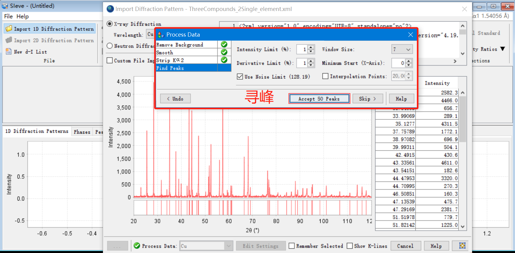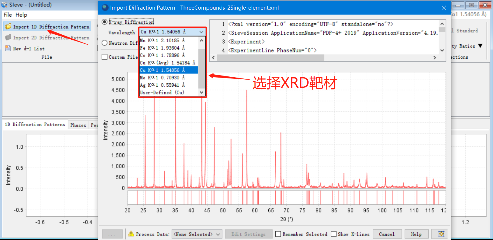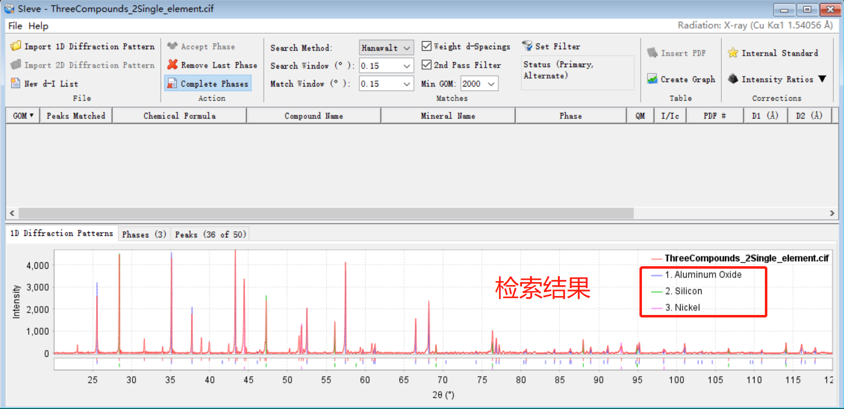 在物相鉴定方面,SIeve/SIeve+提供了多种算法和选项,用户可针对特定化学物质、标准和非标准的XRD图优化检索结果。SIeve/SIeve+采用Hanawalt索引法, Fink索引法及Long-8索引法鉴定物相,并对每个待匹配的物相标识匹配优值(FOM),支持导入 X射线、同步辐射,d-I列表等类型的XRD图。针对对于不同类型的数据,SIeve/SIeve+开发了相应的算法对物相进行分析和优化,与PDF数据库无缝连接,是一款方便、快捷鉴定物相和定量分析的软件。
