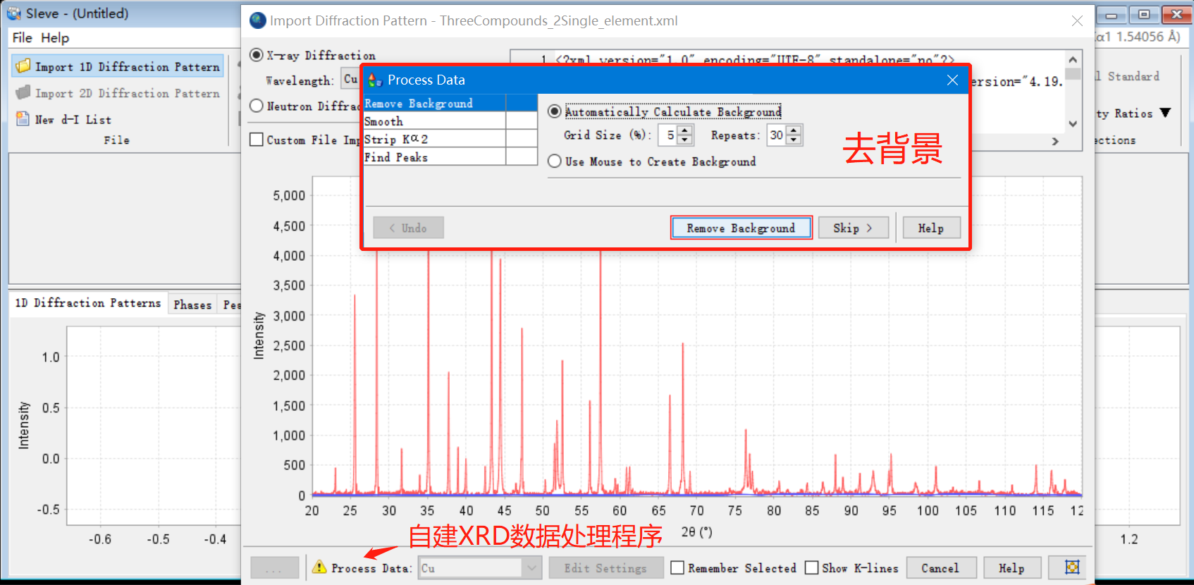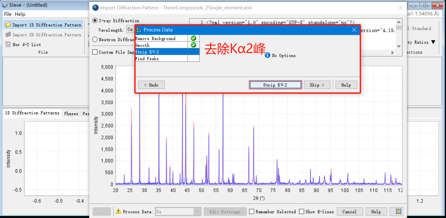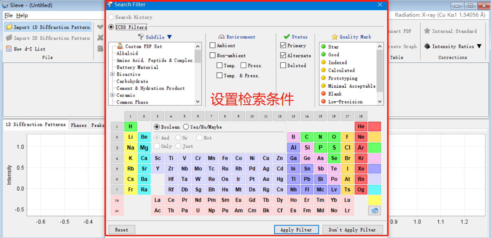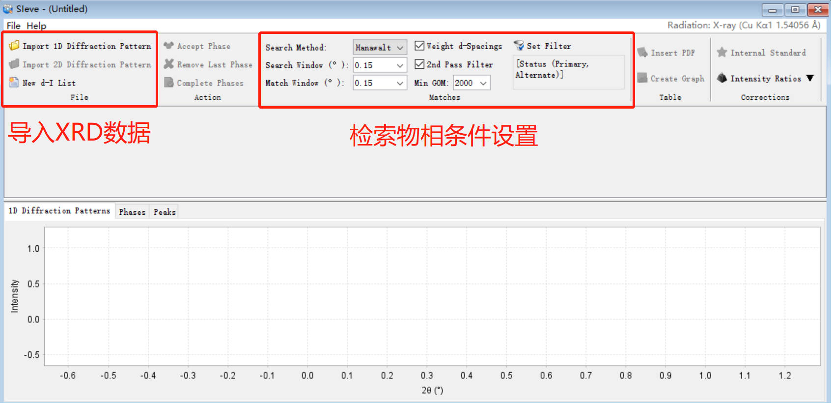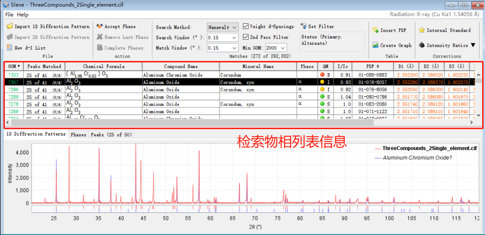 SIeve/Sleve+是ICDD自行开发的物相检索软件,嵌入PDF数据库中。SIeve可与PDF-2数据配套使用,SIeve+可与PDF-5+/4系列数据库配套使用,主要用于XRD图谱的物相鉴定和定量分析(RIR)。可兼容多种XRD数据格式,可对XRD数据进行去除背景,自动、手动识别峰位等,自动进行物相检索,物相检索过程中用户可设定多种物相检索条件,尤其在非晶态材料和复杂物相的鉴定方面具有独特的优势,提高了物相检索的准确性。