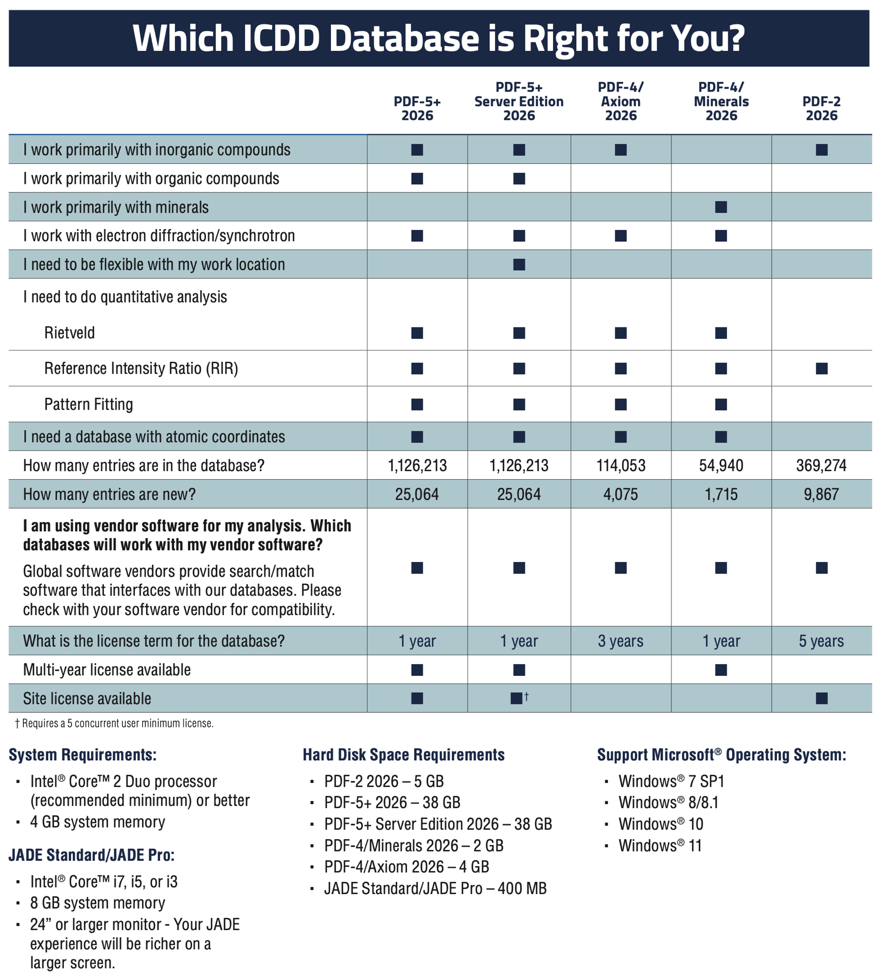 ICDD每年9月份出版最新版本的PDF卡片数据库,2026版PDF数据库包含无机物、有机物在内的PDF卡片共计超过112万张。目前出版发行的PDF数据库类型有PDF-5+,PDF-5+服务器版,PDF-4/Minerals,PDF-4/Axiom和 PDF-2数据库。